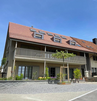 Für die Realisierung des neuen Wohnhauses wurde der Ökonomieteil des ehmaligen Bauernhauses abgebrochen und ein Baukörper mit drei Eigentumswohnungen an den bestehenden Wohnteil angebaut. Das Gebäude ist in Massivbauweise mit hinterlüfteter vertikaler Holzverkleidung erstellt, um den Charakter des Bauernhauses zu erhalten. Der bestehende Schopf wurde zu einer Werkstatt mit Mehrzweckraum umgebaut.